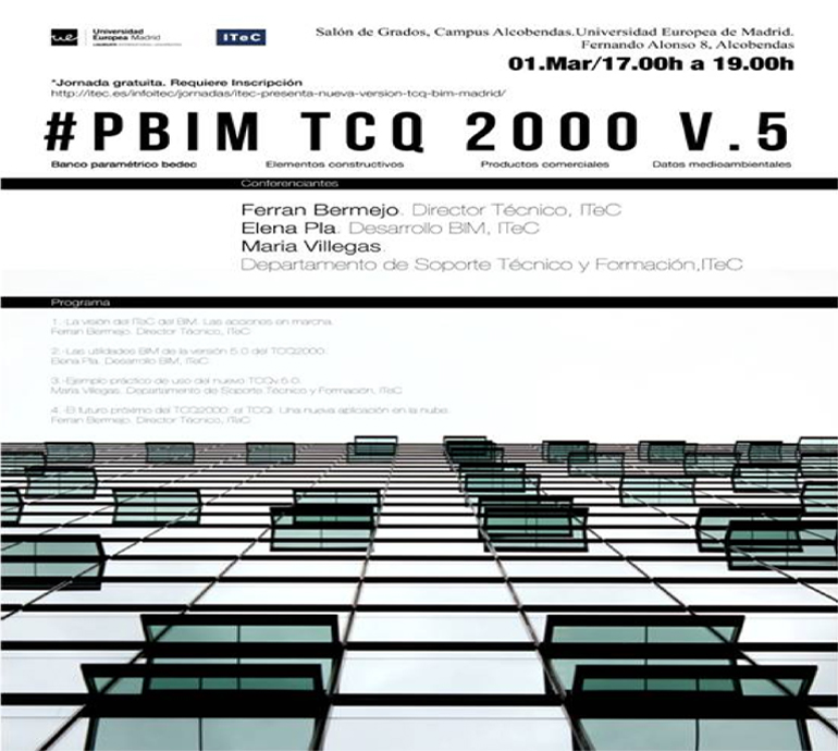 El ITEC ha lanzado la nueva versión de TCQ2000 preparada para el trabajo en un entorno BIM. Esta versión está especialmente dirigida a todos aquellos profesionales del sector que necesiten una herramienta para hacer presupuestos a partir de mediciones extraídas de las plataformas de modelado BIM. Se trata de un conjunto de utilidades BIM multiplataforma multiplataforma integradas en el propio software TCQ2000 que pueden interoperar con cualquiera de las principales herramientas de modelado BIM. No es necesaria la adquisición de pluggins adicionales.