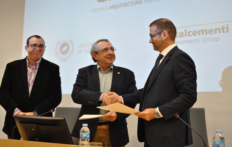 El rector de la Universidad de Málaga, José Ángel Narváez, el consejero delegado de FYM-Italcementi Group, Matteo Rozzanigo, y el director de la ETS de Arquitectura de Málaga, Carlos Rosa, han presentado un convenio de colaboración que renueva la relación entre ambas entidades, en el marco de la Cátedra de Innovación en Materiales de Construcción de la ETS de Arquitectura de la UMA.