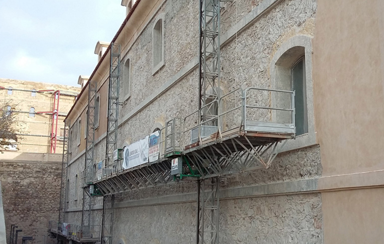 El edificio de la Universidad Politécnica de Cartagena se rehabilitó hace unos 18 años. Se aplicó un tratamiento consistente en descarnar todos los revestimientos hasta llegar al soporte de mampostería para luego regularizar con un maestreado de mortero realizado en obra y posteriormente acabar con un mortero de cal, también realizado de forma artesanal. En 2010 se acometió una nueva actuación para rehabilitar unos 1.000 m2 consistente en picado del mortero de cal en toda la superficie y del maestreado cuando este se encontraba muy deteriorado. Una vez descarnadas todas las zonas afectadas, dejando la mampostería de nuevo al aire, se limpia toda la superficie para eliminar restos de mortero disgregados, se aplica weber.primFX15 como puente de adherencia y se da una primera mano de regularización con weber.tec hydromur, se coloca malla y se aplica una segunda mano del mismo producto en acabado fratasado. La reparación contribuye a mantener un muro sano, sin sales, manteniendo sus funciones técnicas y minimizando el impacto de sales.