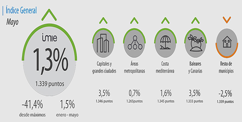 Se ha ralentizado el ritmo de crecimiento, pero aun así la zona ‘Baleares y Canarias’ acumula una revaloración del 4,2% en lo que vamos de año. En el caso de la ‘Costa Mediterránea’ los datos se encuentran en el mismo punto que al cierre del año pasado, las grandes ciudades y las áreas metropolitanas crecen alrededor del 1,3% en los primeros 5 meses del año, algo por debajo del 1,5% que se produce en el grupo ‘Resto de municipios’.