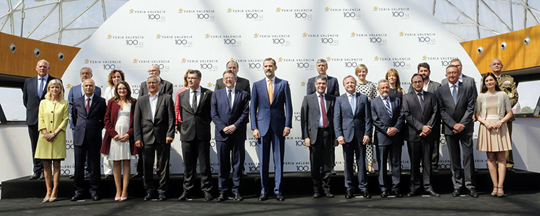 El Rey Felipe VI presidió, el pasado 10 de mayo, la conmemoración del centenario de Feria Valencia en un acto central celebrado en el Centro de Eventos del recinto ferial valenciano y en el que estuvo acompañado, entre otras autoridades, por el presidente de la Generalitat, Ximo Puig; el ministro de Energía, Álvaro Nadal; el alcalde de València, Joan Ribó y el presidente del Comité Ejecutivo de Feria Valencia, José Vicente González.
