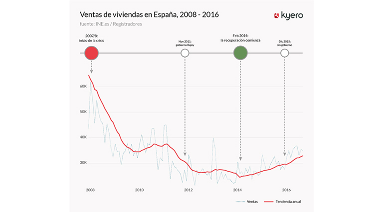 Las ventas de propiedades han incrementado significativamente en nuestro país durante 2016, de acuerdo a los datos del último informe mensual de Kyero, portal inmobiliario para compradores internacionales en España. Tanto es así que la compraventa de viviendas ha aumentado un 15% interanual, entre diciembre de 2015 y diciembre de 2016. Se trata del décimo trimestre de crecimiento consecutivo por primera vez desde el inicio de la crisis.