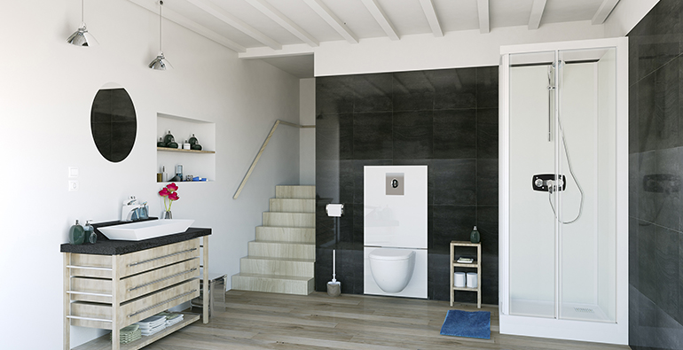 Este conjunto deSFA Sanitrit se puede instalar en pisos, locales comerciales, etc. para montar un cuarto completo, ya que gracias a sus tres entradas, admite las aguas gruesas de un inodoro y las grises de una ducha y un lavabo.